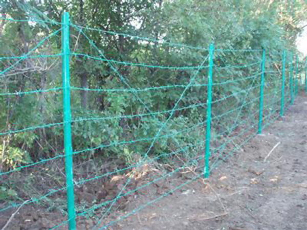 (8)刺绳护栏网一般应顺着地势设置。需进行土整齐平,以取得整齐的外观。在低洼地区,当地面纵剖面发生突变,无法坚持规则的离地净高时,可使用较长的立柱,然后拉上多股带刺铁丝。带刺铁丝之间的垂直净空等于或小于150mm.在开挖或钻孔之后,立柱应按同意的办法埋设。立柱一般每隔100m应在其两边加斜撑,以保证其稳定性;刺绳护栏网在改变方向的当地,立柱应设三向斜撑。